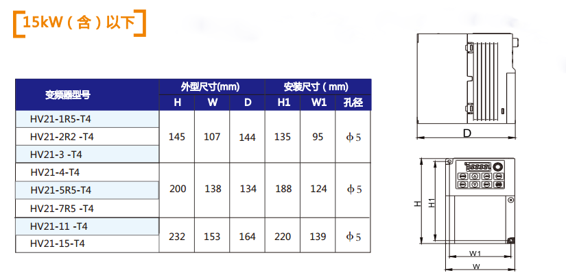 HV21系列变频器适用于功率范围1.5kW-355kW的400V三相异步电机。可广泛应用于标准风机和泵类控制系统。符合IEC/EN61800-3,IEC/EN61000-4,IEC/EN60721-3,IEC/EN61800-5-1等国际标准。